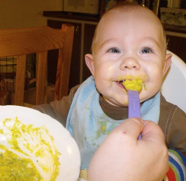 Vi har försökt mata Simon med burkmat de senaste dagarna, för att han ska äta både hemlagat och burkmat, för enkelhetens skull. Tji fick vi, burkmat smakar apa tydligen.